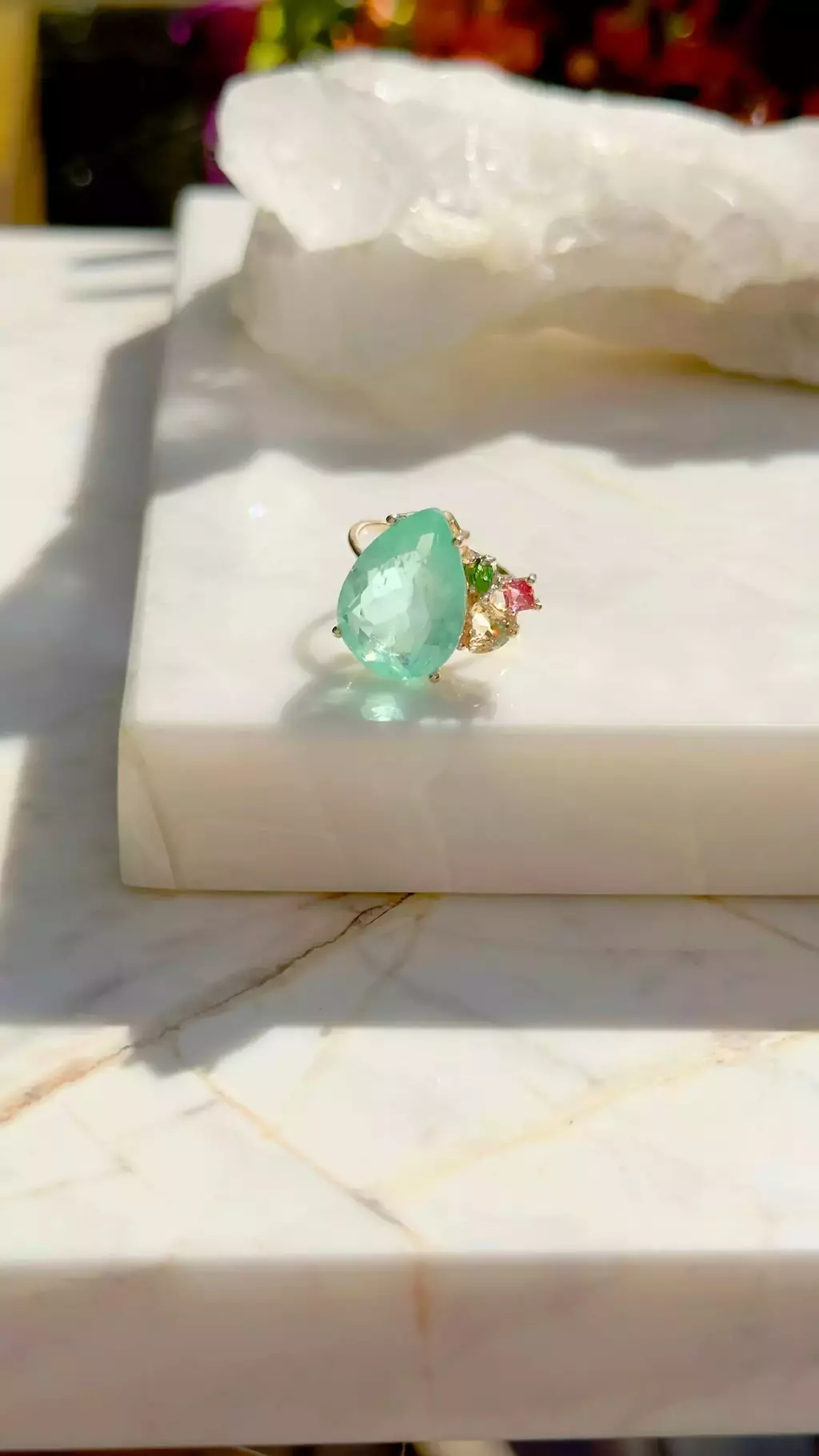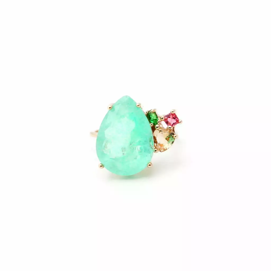 Anel de gota de fusion esmeralda colombiana, cravação de garras e cristais de morganita, peridoto e turmalina rosa. Banho de ouro 18k Antialérgico, não contém níquel Garantia de 1 ano para banho Confeccionado com pedras sintéticas/cristais