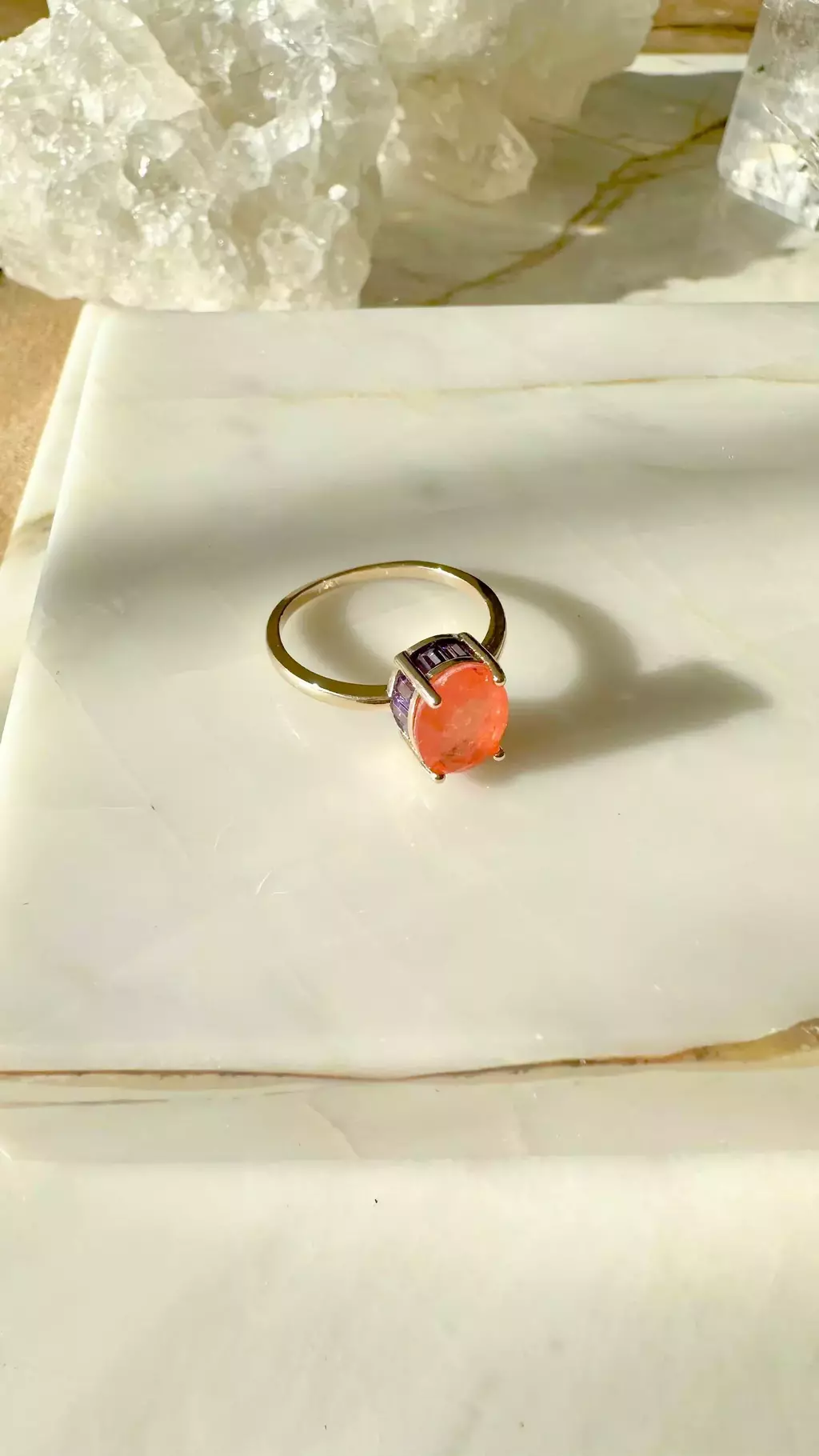 Anel oval de fusion podange com cravação de caixa e detalhes de cristais de ametista. Confira mais opções de semijoias para sua loja. Garanta novidades e lucre na revenda! Banho de ouro 18k Antialérgico, não contém níquel